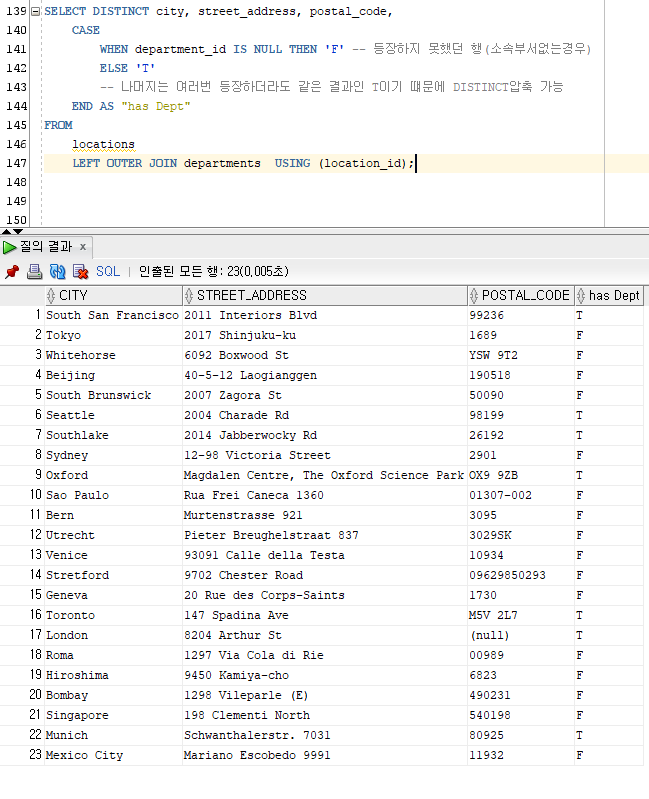 LEFT OUTER JOIN departments d ON l.location_id = d.location_id;