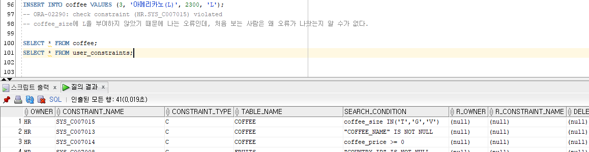 - 제약조건 이름을 설정하지 않으면 오라클에서 생성한 자동 이름을 사용한다.