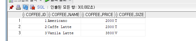 INSERT INTO coffee VALUES (3, '아메리카노(L)', 2300, 'L');