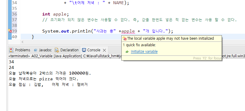 초기화가 되지 않은 변수는 사용할 수 없다. 즉, 값을 한번도 넣은 적 없는 변수는 사용 할 수 없다.